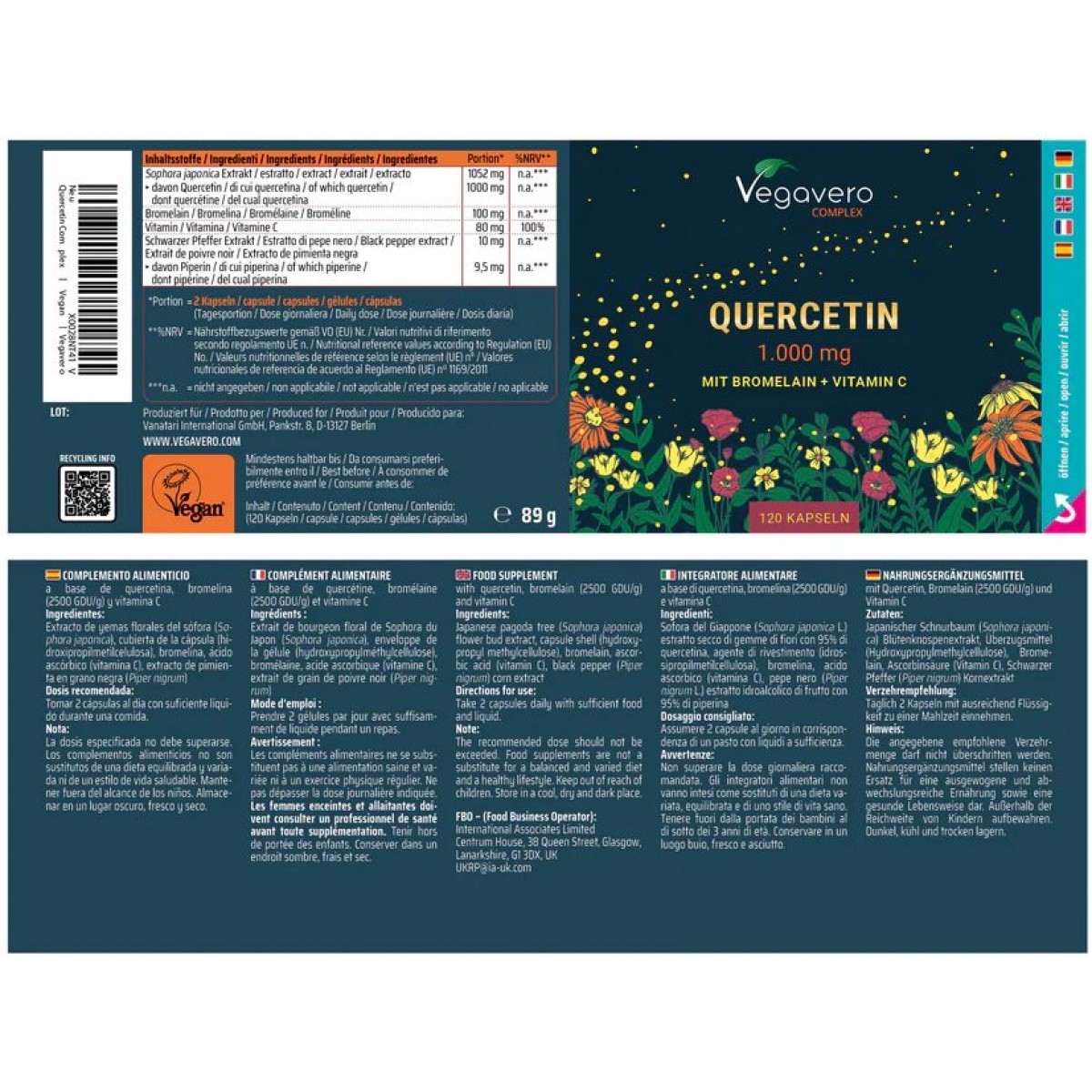| Sofora del Giappone (Sophora japonica L.) estratto secco di gemme di fiori con 95% di quercetina, agente di rivestimento (idrossipropilmetilcellulosa), bromelina, acido ascorbico (vitamina C), pepe nero (Piper nigrum L.) estratto idroalcolico di frutto con 95% di piperina. |